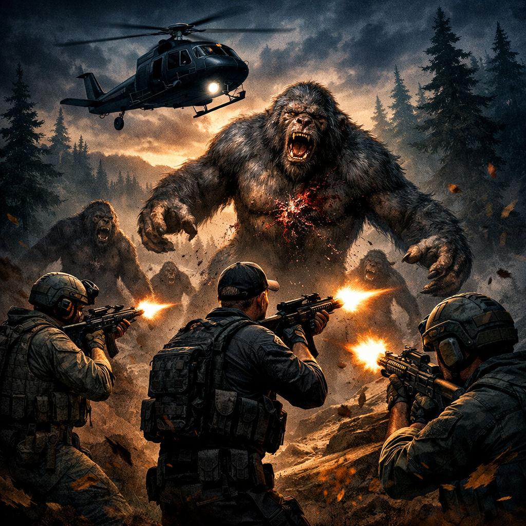 The male hiker's body was found twenty five feet up in a tree with his neck broken. The female hiker was never found. What search teams did find were massive humanoid footprints ranging from sixteen inches to nearly twenty three inches long pressed deep into the soil along a remote creek drainage. Joe's team was briefed by an unnamed civilian and given a single objective: locate and eliminate the creatures responsible.